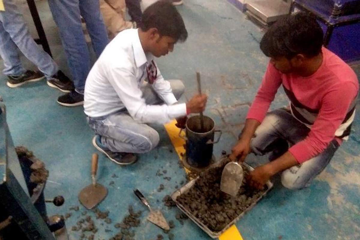 It was a practical session, where the participants had hands on experience on conducting tests on fresh concrete as per IS codal provisions. The session was conducted by Mr. Diptendu Roy. Tests conducted in session 11 clarified tests performed on fresh concrete. The participants were made to make M30 grade mix for which the mix proportion was already made available to them. They made a mix for 3 cubes, conducted tests on workability such as slump cone, flow table test, compaction factor and their relevance to mix design were made clear. It was followed by testing of already prepared cube samples for compressive strength under CTM and rebound hammer test.